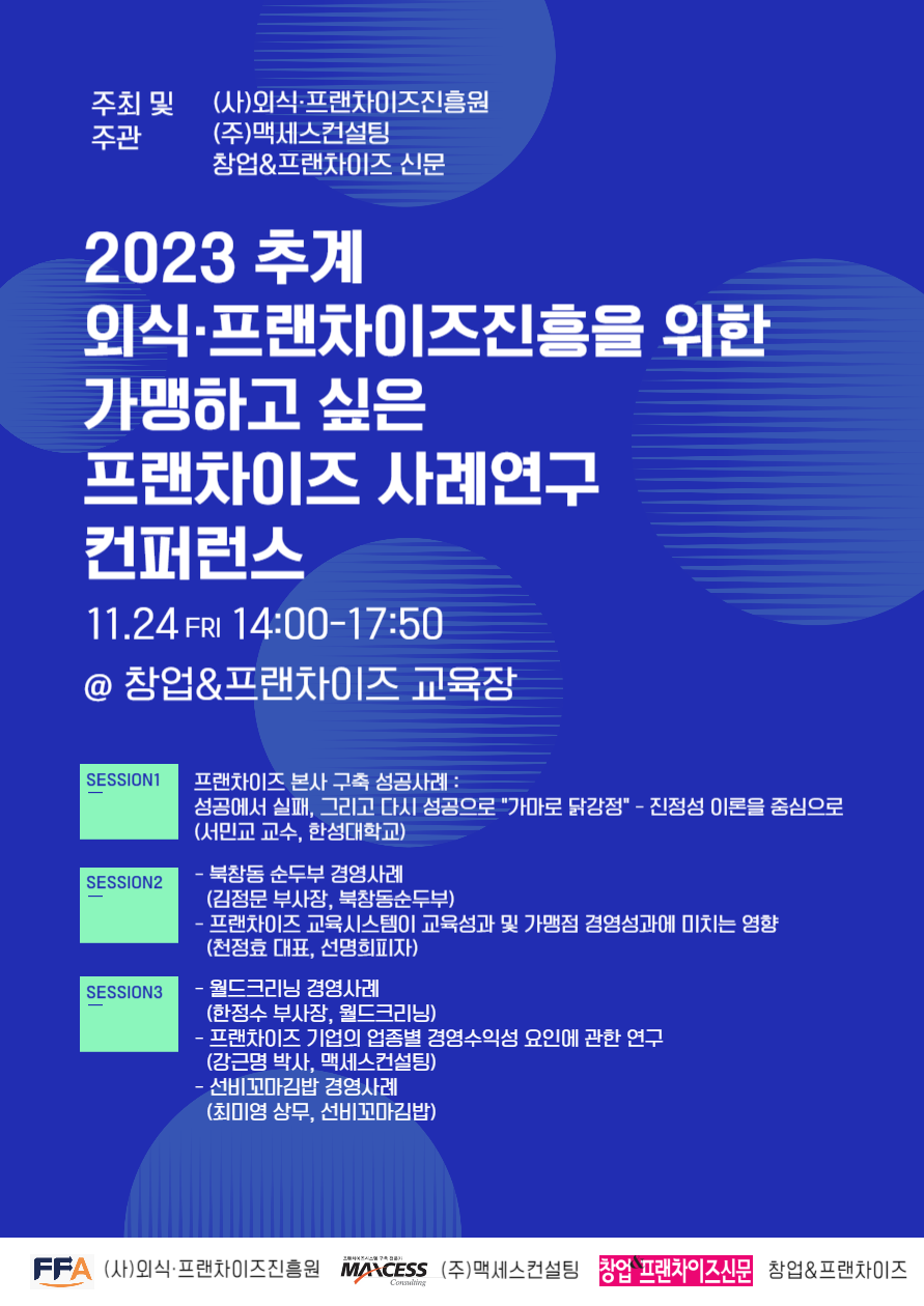 마지막으로 한정수 월드크리닝 부사장과 최미영 선비꼬마김밥 상무가 경영사례를 발표하고, 강근명 맥세스컨설팅 박사가 프랜차이즈 기업의 업종별 경영 수익성 요인에 관한 연구를 주제로 발표한다. 주성희 한성대학교 교수가 좌장으로 권민희 맥세스컨설팅 박사, 김종현 메디머스 대표, 한경민 청년다방 대표가 토론하는 순서로 진행될 예정이다.